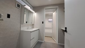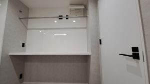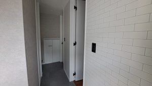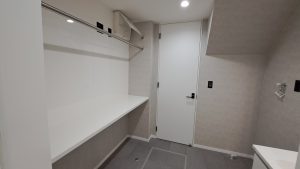 そして、ドアの横には物干しを設置し、キッチンパネルを使用して、汚れが付きにくく