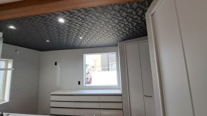 キッチンの天井にもアクセントあり、背面にもキッチンパネルを使用しています。