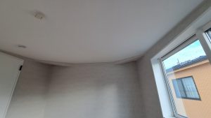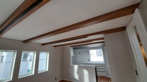 また、勾配天井になっています。明るいお部屋に、温かみのある床材、グレーの壁紙で落ち着いた印象にしました。